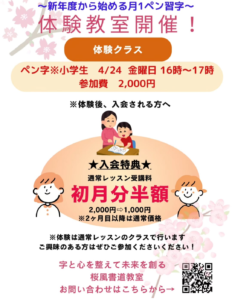 新年度スタート小学生ペン習字体験教室 ■日付■ 4月24日(金) 16:00~17:00 ■定員■ 2名 ■料金 […]